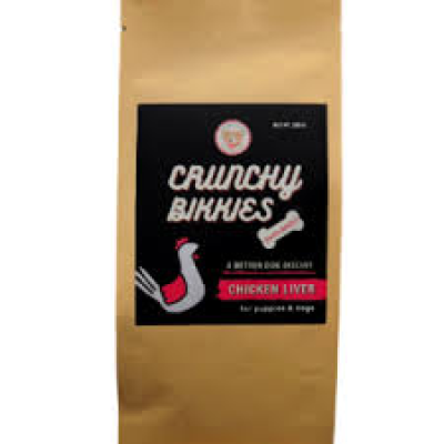 Oven baked, very crunchy chicken liver dog biscuits made with real chicken liver and fortified with Vitamin E.
