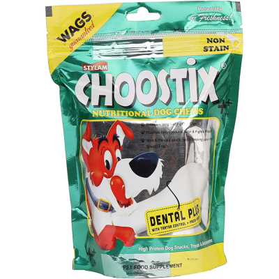 Keeping your dog’s teeth clean is important for maintaining good health in them. As dogs tend to chew most of the things they encounter, they are very much vulnerable to bacteria. Choostix Dental Plus Dog Treat 450 gms is a premium quality Rawhide treat having Mint and Parsley which supports good oral hygiene in dogs and gives them a refreshing breath. The chewy texture of the treat gives a good workout to the teeth and eliminates the buildup of Tartar. The treat also fulfils the natural urge of chewing in dogs and keeps them thoroughly engaged. The consistent chewing of the treat stimulates saliva which helps in boosting the digestive mechanism. Choostix Dental Plus Dog Treat can be fed to all dog breeds.Â